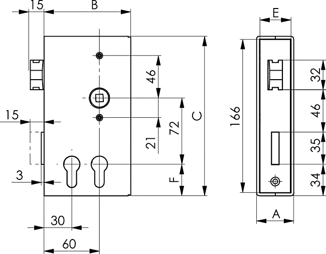 Schlosskasten für zwei Profilzylinder, blank