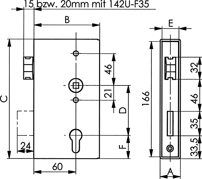 mit verzinktem Schloss Nr. 142UM-**. Falle und Riegel aus Messing. Rechts und links verwendbar durch umdrehbaren Fallenkopf. Vorgerichtet für Profilzylinder (PZ) oder für Buntbart-Nachrüstsatz. Mit Wechsel.
