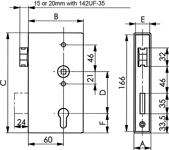 mit verzinktem Schloss Nr. 142UM-**. Falle und Riegel aus Messing. Rechts und links verwendbar durch umdrehbaren Fallenkopf. Vorgerichtet für Profilzylinder (PZ) oder für Buntbart-Nachrüstsatz. Mit Wechsel.