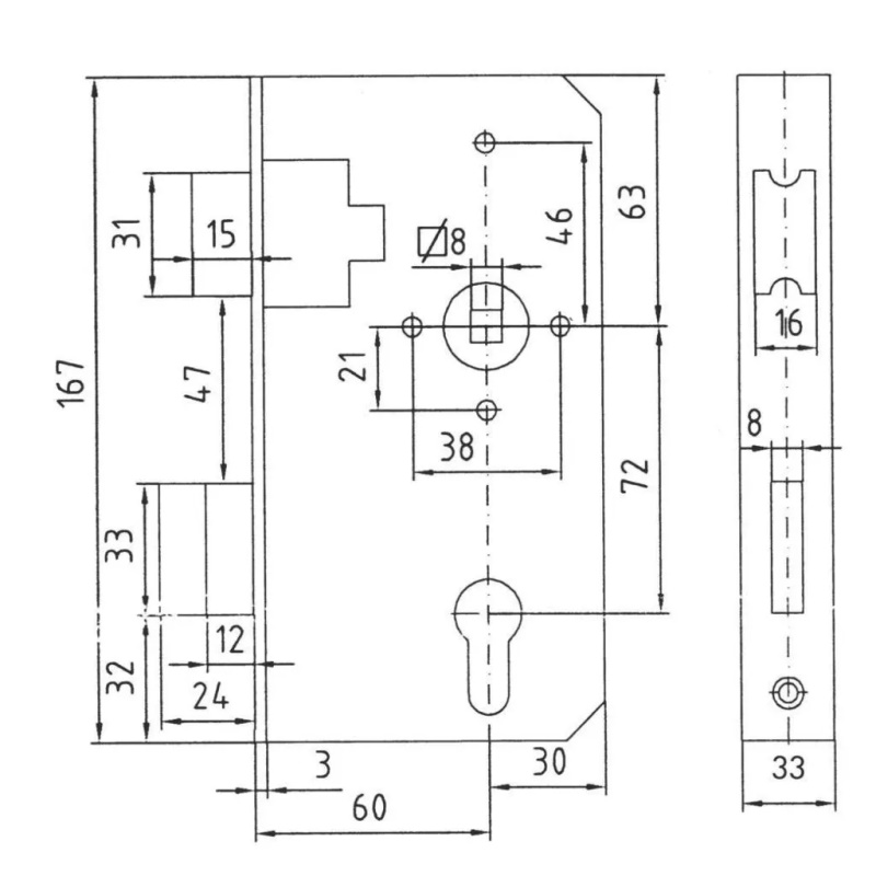 Produktinformationen "Bever & Klophaus Tor-Schlosskasten 460 461 P, mit verzinktem Schloss, Profilzylinder, D60,E72,VK8, 33 kantig"