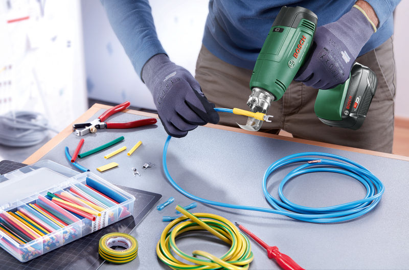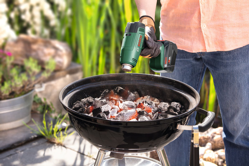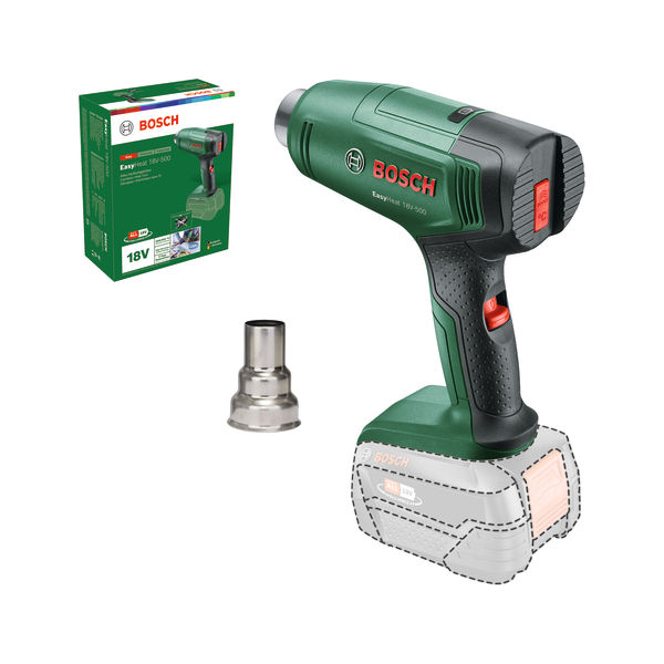 Akku-Heißluftgebläse EasyHeat 18V-500. Tragbares Heißluftgebläse für schnelle und einfache Heißluftanwendung. Akku-Heißluftgebläse für Heimwerker zum schnellen Erledigen von Arbeiten, auch unterwegs: ideal zum Schrumpfen von Kabeln, Entfernen von Etiketten und anderen einfachen Aufgaben. Überlegene Heizelement-Technologie: gleichmäßige Wärmeverteilung für eine schnelle und präzise Heißluftanwendung. Constant Power: Sorgt für ein gleichbleibendes Temperaturniveau über die gesamte Akkulaufzeit. Boost-Modus: für Aufgaben, die hohen Temperaturen erfordern, wie Entfernen von Farbe oder Anzünden eines Holzkohlegrills. Gummierte Rückseite: stabile Parkposition dank rutschfester Oberfläche. Kompatibel mit Bosch 18V POWER FOR ALL Akku - für optimale Leistung 4 Ah oder höher verwenden. Kartonschachtel. Reduzierdüse (1 609 201 648)