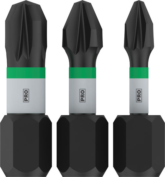Robustes Eindrehen von Schrauben! Die spezielle Torsionszone absorbiert die Drehmomentbelastung an der Spitze des Bohrers Benötigst du Pozidriv-Schrauberbits für das Eindrehen von Schrauben? Bits, die lange halten und bei anspruchsvollen Anwendungen gut funktionieren? Dann sind die PRO PZ Impact Bits die richtige Wahl. Sie sind auf Stärke und Widerstandsfähigkeit gegenüber hohem Drehmoment ausgelegt. Die PRO PZ Impact Bits sind eine gute Wahl für Installateure, die auf der Suche nach robusten Schrauberbits für harte Einsätze sind. Die Bits bestehen aus wärmebehandeltem, modifiziertem Stahl für hervorragende Stabilität und Widerstandsfähigkeit gegen hohe Drehmomente. Ihre Torsionszone absorbiert die Drehmomentbelastung an der Spitze der Bits, um sicherzustellen, dass sie nicht brechen. Sie verfügen über farbcodierte Ringe, die den Kopftyp anzeigen, und Lasermarkierungen, die dir bei der Auswahl der benötigten Größe helfen.