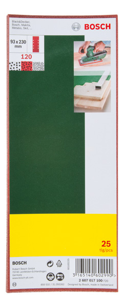 Inhalt: 25 Schleifblätter Klett 11 Löcher 102 x 62 mm 5 Stück Körnung 40 5 Stück Körnung 120 5 Stück Körnung 180 10 Stück Körnung 80