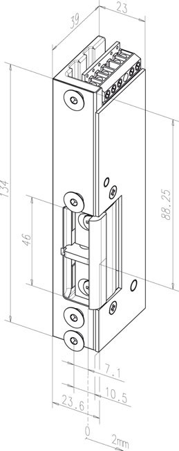 effeff, Türrahmen-FH-Türöffner, Modellnummer: 13106FF, Ausführung: ohne Schließblech, Bauform: asymmetrisch, Ergänzung: stabile Bauform, mit verstellbarer Falle, mit Rückmeldekontakt, mit Diode, mit elektrischer Dauerentriegelung, DIN-Richtung: DIN Rechts, Einbaulage: senkrecht, waagerecht, Entriegelung: ohne, Funktion: Arbeitsstrom, Kompatibel: zu Standard Schließblech, Befestigungsart: zum Einlassen, Material Gehäuse: Stahlfeinguss, Einzelteilmaterial Falle: Stahlfeinguss, Einzelteilmaterial Aufschraubstück: Stahl, Öffnerbreite: 23 mm, Öffnerhöhe: 134 mm, Öffnertiefe: 39 mm, Verstellbereich Falle: 2 mm, Spannung: 24 V, Spannungsart: DC, Stromanschluss: klemmbar, steckbar, Stromaufnahme AC: 70 mA, Stromaufnahme DC: 140 mA, Fallenvorlast AC max.: 150 N, Fallenvorlast DC max.: 150 N, Aufbruchfestigkeit: 10.000 N, Betriebstemperatur min.: -15 °C, Betriebstemperatur max.: 40 °C, Nennwiderstand: 175 O, Türart: Abschlusstür, Türausprägung: Türe gefälzt, Türe stumpf, Türflügelanzahl: einflügelig, Rahmenwerkstoff: Holz, Aluminium, Kunststoff, Zulassung: für Feuerschutz, Norm: DIN EN 14846