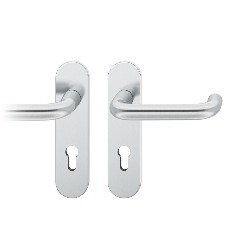 Produktinformationen "FSB Drückergarnitur 72 1070, Kurzschild, oval, Profilzylinder gelocht, Entfernung 72mm, Vierkant 8mm, DIN Rechts, Türstärke 39 - 48mm, Befestigungstechnik mit Stütznocken, grau, edelstahl, fein matt,35°"