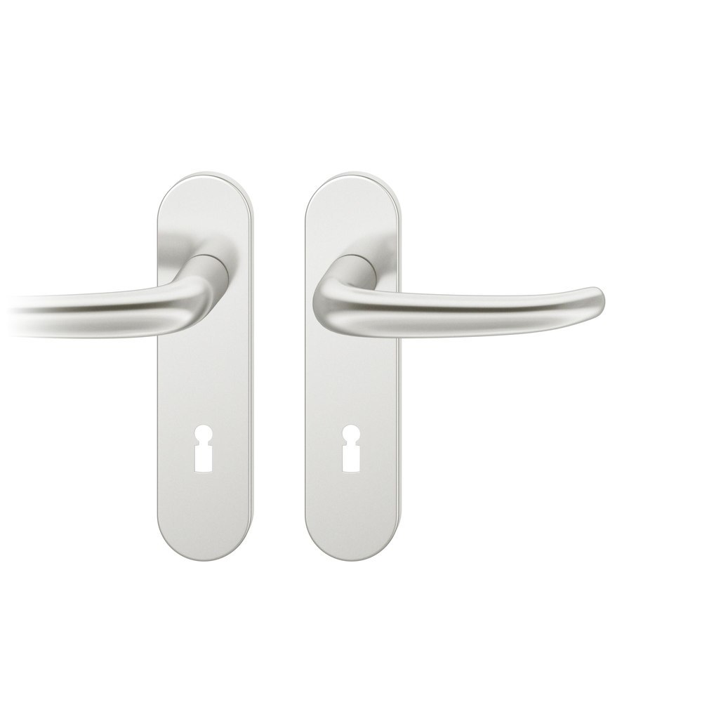 Produktinformationen "FSB Drückergarnitur 12 1023, Kurzschild, oval, Buntbart gelocht, Entfernung 72mm, Vierkant 8mm, DIN Links-Rechts, Türstärke 39 - 58mm, mit Stütznocken, naturfarben eloxiert, Adapter-Standardlager"