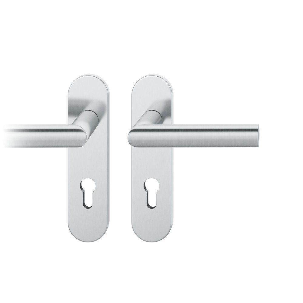 Produktinformationen "FSB Drückergarnitur 12 1108, Kurzschild, oval, Profilzylinder gelocht, Entfernung 72mm, Vierkant 8mm, DIN Links-Rechts, Türstärke 39 - 58mm, mit Stütznocken, edelstahl fein matt, Adapter-Standardlager"
