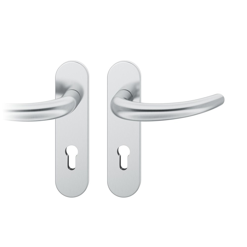 Produktinformationen "FSB Drückergarnitur 12 1160, Kurzschild, oval, Profilzylinder gelocht, Entfernung 72mm, Vierkant 8mm, DIN Links-Rechts, Türstärke 39 - 58mm, mit Stütznocken, edelstahl fein matt, Adapter-Standardlager"