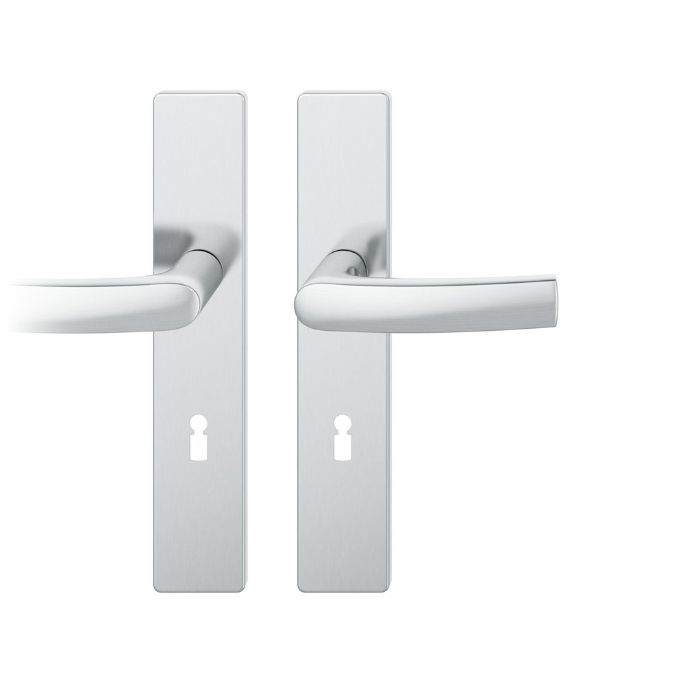 FSB Drückergarnitur 12 1015; Produkttyp: Drückergarnitur; Produkttyp (Hersteller): Drückergarnitur; Ausführung: Langschild; Befestigungsart: verdeckt verschraubt; Befestigungstechnik: mit Stütznocken; Form: eckig; Vierkant: 8 mm; Material: Edelstahl; Form Türgriff (innen): gebogen; Form Türgriff (außen): gebogen; Breite Türgriff (innen): 22 mm; Breite Türgriff (außen): 22 mm; Länge Türgriff (innen): 122 mm; Länge Türgriff (außen): 122 mm; Höhe Türgriff (innen): 55 mm; Höhe Türgriff (außen): 55 mm; Schildbreite außen: 45 mm; Schildbreite innen: 45 mm; Schildlänge außen: 245 mm; Schildlänge innen: 245 mm; Schildstärke außen: 7 mm; Schildstärke innen: 7 mm; Lagerung: festdrehbar, Adapter-Standardlager; Einsatzbereich: Zimmertür; Türart: Vollblatt; Türwerkstoff: Stahl, Holz; Norm: DIN EN 1906; Lochung: Buntbart gelocht; Entfernung: 72 mm; DIN-Richtung: DIN Links-Rechts; Farbe: grau; Farbton: edelstahl; Oberfläche: fein matt; Ausführung Vierkant: Stabilstift; Betätigungswinkel max.: 45 °; Türstärke min.: 39 mm; Türstärke max.: 58 mm