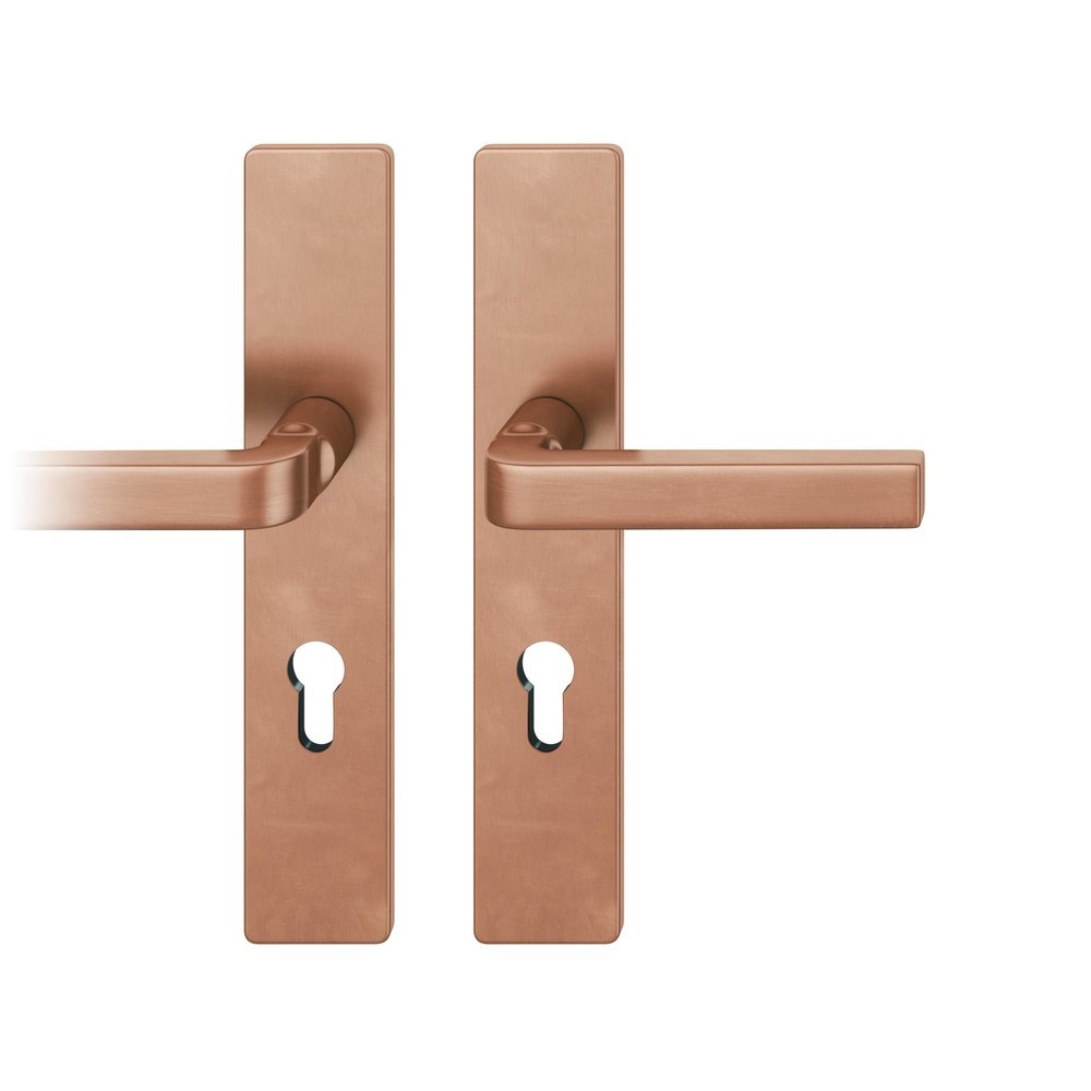 Produktinformationen "FSB Drückergarnitur 72 1004, Langschild, eckig, Profilzylinder gelocht, Entfernung 72mm, Vierkant 8mm, DIN Links, Türstärke 39 - 48mm, mit Stütznocken, hellbronze patiniert gewachst, Ausgleichslager® 3"