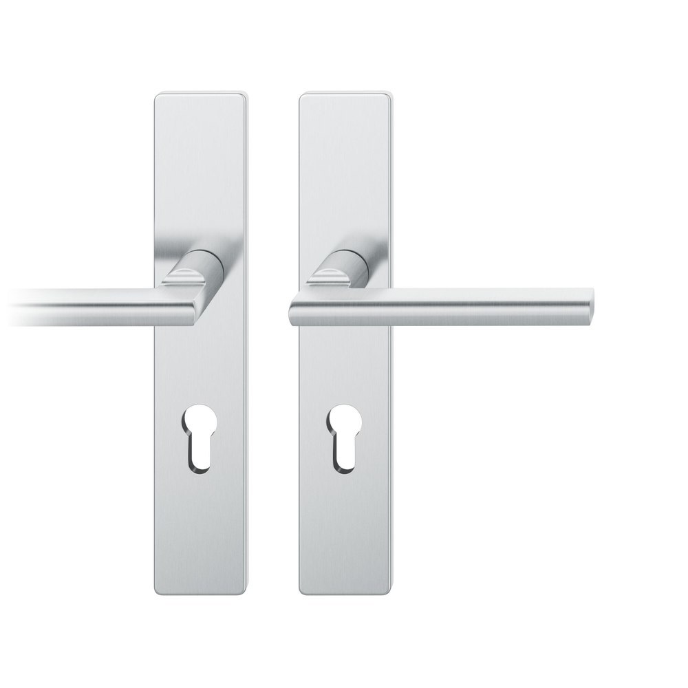 Produktinformationen "FSB Drückergarnitur 72 1035, Langschild, eckig, Profilzylinder gelocht, Entfernung 72mm, Vierkant 8mm, DIN Links, Türstärke 39 - 48mm, Befestigungstechnik mit Stütznocken, grau, edelstahl, fein matt, 35°"