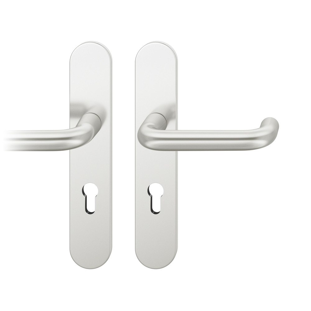 Produktinformationen "FSB Drückergarnitur 72 1070, Langschild, oval, Profilzylinder gelocht, Entfernung 72mm, Vierkant 8mm, DIN Rechts, Türstärke 39 - 48mm, Befestigungstechnik mit Stütznocken, silber, naturfarben, eloxiert, 35°"