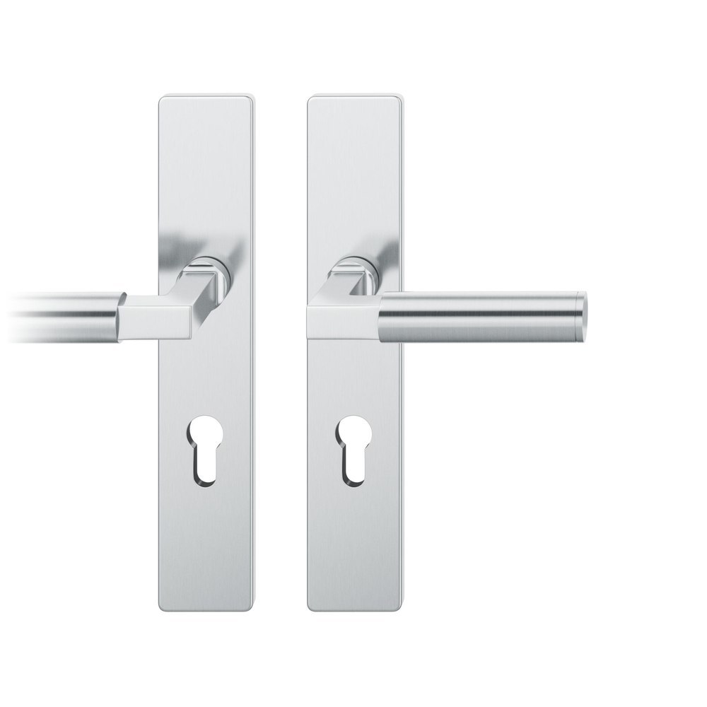 Produktinformationen "FSB Drückergarnitur 72 1102, Langschild, eckig, Profilzylinder gelocht, Entfernung 72mm, Vierkant 8mm, DIN Links, Türstärke 39 - 48mm, mit Stütznocken, edelstahl fein matt, Ausgleichslager® 3"