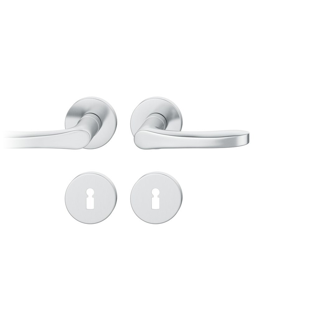 FSB Drückergarnitur 12 1106; Produkttyp: Drückergarnitur; Produkttyp (Hersteller): Drückergarnitur; Ausführung: Rosette; Befestigungsart Drückerrosette (außen): verdeckt verschraubt; Befestigungsart Drückerrosette (innen): verdeckt verschraubt; Befestigungsart Schlüsselrosette (außen): verdeckt verschraubt; Befestigungsart Schlüsselrosette (innen): verdeckt verschraubt; Befestigungstechnik: mit Stütznocken; Montageart: aufliegend; Form Drückerrosette: rund; Form Schlüsselrosette (außen): rund; Form Schlüsselrosette (innen): rund; Vierkant: 8,5 mm; Material: Edelstahl; Material Unterkonstruktion (Griffrosette): Kunststoff-Edelstahlverbundbau; Form Türgriff (innen): gebogen; Form Türgriff (außen): gebogen; Durchmesser Schlüsselrosette: 55 mm; Länge Türgriff (innen): 119 mm; Länge Türgriff (außen): 119 mm; Höhe Türgriff (innen): 61 mm; Höhe Türgriff (außen): 61 mm; Durchmesser Drückerrosette (außen): 55 mm; Durchmesser Drückerrosette (innen): 55 mm; Höhe Drückerrosette (außen): 7 mm; Höhe Drückerrosette (innen): 7 mm; Höhe Schlüsselrosette (außen): 7 mm; Höhe Schlüsselrosette (innen): 7 mm; Lagerung: mit Rückholfeder, Adapter-Standardlager, festdrehbar; Einsatzbereich: Objekttür; Türart: Vollblatt; Türwerkstoff: Stahl, Holz; Lochung: Buntbart gelocht; DIN-Richtung: DIN Links-Rechts; Farbe: grau; Farbton: edelstahl; Oberfläche: fein matt; Material Unterkonstruktion (Schlüsselrosette): Kunststoff-Edelstahlverbundbau; Ausführung Vierkant: Stabilstift; Betätigungswinkel max.: 45 °; Design Türdrücker: Christoph Mäckler; Türstärke min.: 39 mm; Türstärke max.: 58 mm; Norm: DIN EN 1906