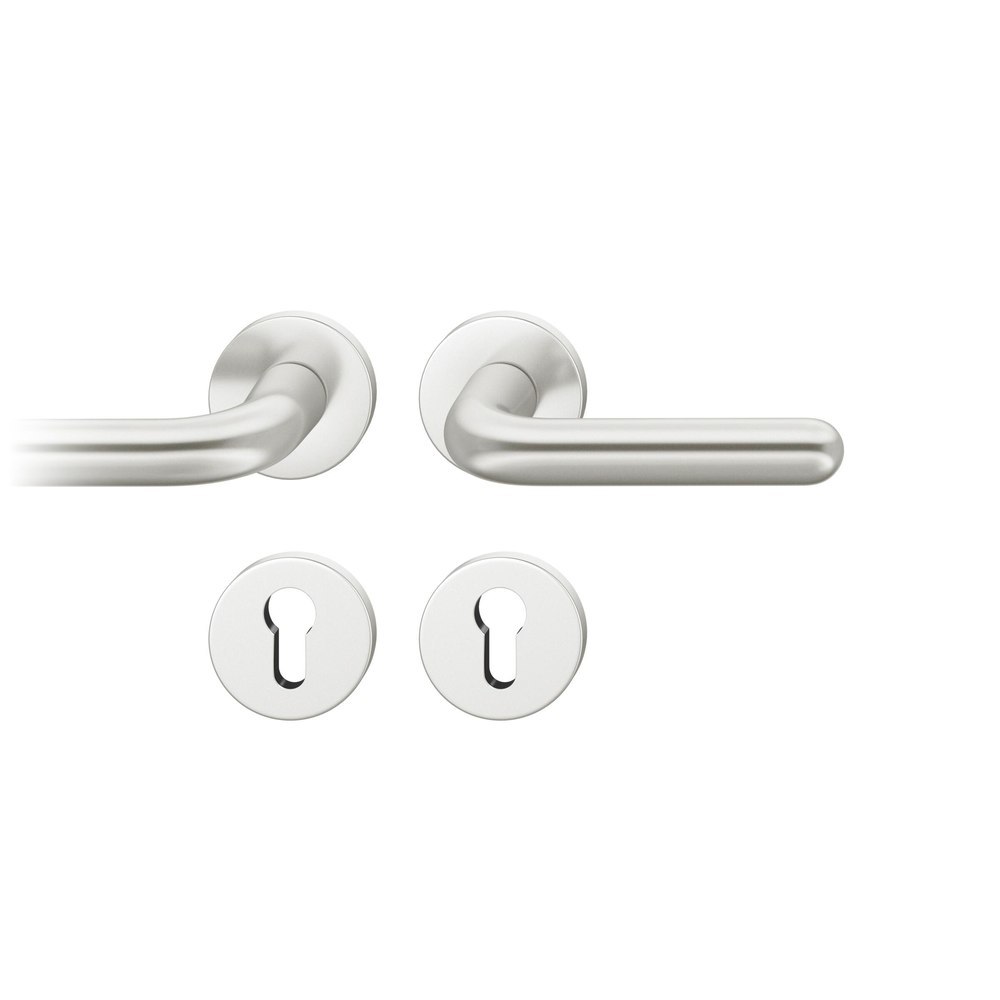 FSB Drückergarnitur 72 1147; Produkttyp: Drückergarnitur; Produkttyp (Hersteller): Drückergarnitur; Ausführung: Rosette; Befestigungsart Drückerrosette (außen): verdeckt verschraubt; Befestigungsart Drückerrosette (innen): verdeckt verschraubt; Befestigungsart Schlüsselrosette (außen): verdeckt verschraubt; Befestigungsart Schlüsselrosette (innen): verdeckt verschraubt; Befestigungstechnik: mit Stütznocken; Montageart: aufliegend; Form Drückerrosette: rund; Form Schlüsselrosette (außen): rund; Form Schlüsselrosette (innen): rund; Vierkant: 8 mm; Material: Aluminium; Material Unterkonstruktion (Griffrosette): Kunststoff-Edelstahlverbundbau; Form Türgriff (innen): gebogen; Form Türgriff (außen): gebogen; Durchmesser Türgriff (innen): 20 mm; Durchmesser Türgriff (außen): 20 mm; Durchmesser Schlüsselrosette: 55 mm; Länge Türgriff (innen): 132 mm; Länge Türgriff (außen): 132 mm; Höhe Türgriff (innen): 63 mm; Höhe Türgriff (außen): 63 mm; Durchmesser Drückerrosette (außen): 55 mm; Durchmesser Drückerrosette (innen): 55 mm; Höhe Drückerrosette (außen): 7 mm; Höhe Drückerrosette (innen): 7 mm; Höhe Schlüsselrosette (außen): 7 mm; Höhe Schlüsselrosette (innen): 7 mm; Lagerung: mit Rückholfeder, Ausgleichslager® 3, festdrehbar; Einsatzbereich: Objekttür; Türart: Vollblatt; Türwerkstoff: Stahl, Holz; Lochung: Profilzylinder gelocht; DIN-Richtung: DIN Links; Farbe: silber; Farbton: naturfarben; Oberfläche: eloxiert; Betätigungswinkel max.: 35 °; Türstärke min.: 39 mm; Türstärke max.: 48 mm; Norm: DIN EN 1906; EN 1906 - Gebrauchskategorie: Klasse 4; EN 1906 - Dauerhaftigkeit: Klasse 7; EN 1906 - Türmasse: -; EN 1906 - Feuerbeständigkeit: Klasse 0; EN 1906 - Sicherheit: Klasse 1; EN 1906 - Korrosionsbeständigkeit: Klasse 5; EN 1906 - Einbruchschutz: Klasse 0; EN 1906 - Ausführungsart: Typ B; Klassifizierungsschlüssel EN 1906: 47-0150B