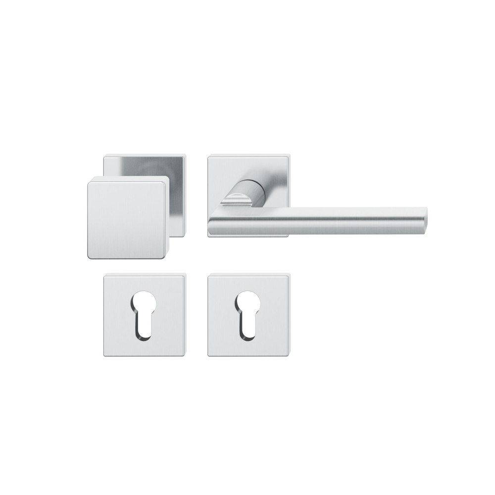 FSB Wechselgarnitur 76 1035; Produkttyp: Wechselgarnitur; Produkttyp (Hersteller): Wechselgarnitur; Ausführung: Rosette; Befestigungsart Drückerrosette (außen): verdeckt verschraubt; Befestigungsart Drückerrosette (innen): verdeckt verschraubt; Befestigungsart Schlüsselrosette (außen): verdeckt verschraubt; Befestigungsart Schlüsselrosette (innen): verdeckt verschraubt; Befestigungstechnik: mit Stütznocken; Montageart: aufliegend; Form Drückerrosette: eckig; Form Schlüsselrosette (außen): eckig; Form Schlüsselrosette (innen): eckig; Vierkant: 9 mm; Material: Edelstahl; Form Türgriff (innen): L-Form; Form Türgriff (außen): Flachknopf; Ausführung Türgriff (außen): fest; Gewinde Knopf/Griffplatte: M12; Breite Türgriff (innen): 21 mm; Breite Türgriff (außen): 50 mm; Länge Türgriff (innen): 137 mm; Höhe Türgriff (innen): 58 mm; Höhe Türgriff (außen): 46 mm; Breite Drückerrosette (außen): 55 mm; Breite Drückerrosette (innen): 55 mm; Länge Drückerrosette (außen): 55 mm; Länge Drückerrosette (innen): 55 mm; Höhe Drückerrosette (außen): 7 mm; Höhe Drückerrosette (innen): 7 mm; Breite Schlüsselrosette (außen): 55 mm; Breite Schlüsselrosette (innen): 55 mm; Länge Schlüsselrosette (außen): 55 mm; Länge Schlüsselrosette (innen): 55 mm; Höhe Schlüsselrosette (außen): 7 mm; Höhe Schlüsselrosette (innen): 7 mm; Lagerung: festdrehbar, Ausgleichslager® 3; Einsatzbereich: Objekttür; Türart: Vollblatt; Türwerkstoff: Stahl, Holz; Lochung: Profilzylinder gelocht; DIN-Richtung: DIN Rechts; Farbe: grau; Farbton: edelstahl; Oberfläche: fein matt; Ausführung Vierkant: Rollenwechselstift; Betätigungswinkel max.: 35 °; Design Türdrücker: Heike Falkenberg; Türstärke min.: 39 mm; Türstärke max.: 48 mm; Norm: DIN 18273, DIN EN 1906; Zulassung: für Feuerschutz, für Rauchschutz