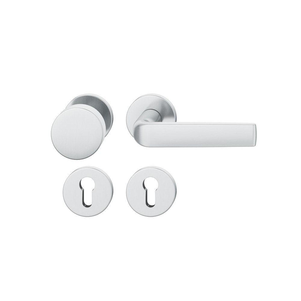 Produktinformationen "FSB für Feuerschutz Wechselgarnitur 76 1267, Ausführung Türgriff (außen) fest, Rosette, rund, Profilzylinder gelocht, Vierkant 9mm, DIN Links, Türstärke 39 - 48mm, mit Stütznocken, edelstahl fein matt Ausgleichslager® 3"