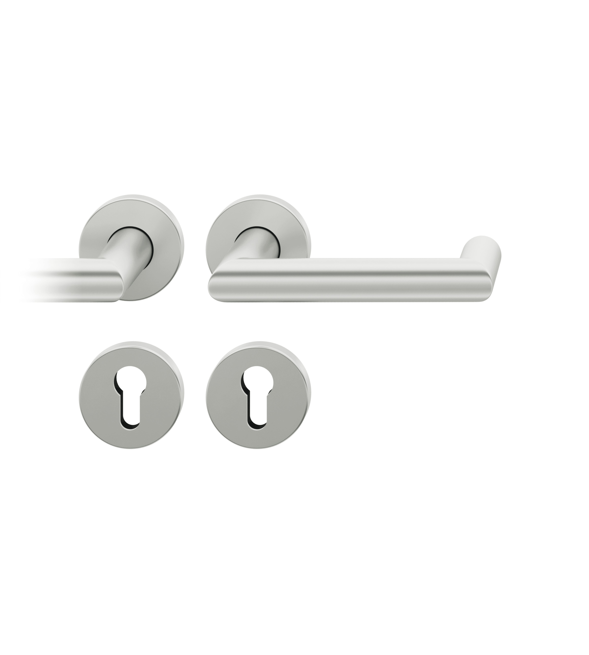 Die Komplett-Garnitur 1016 von FSB verfügt über eine U-förmige Gestaltung, bei der drei Rundstäbe in einem Gehrungsschnitt von 90 Grad zusammengesetzt worden sind. Die Grifflänge beträgt ca. 143 mm. Die Türgarnitur ist wahlweise als WC/Bad-, Wechsel- oder Drückergarnitur erhältlich.