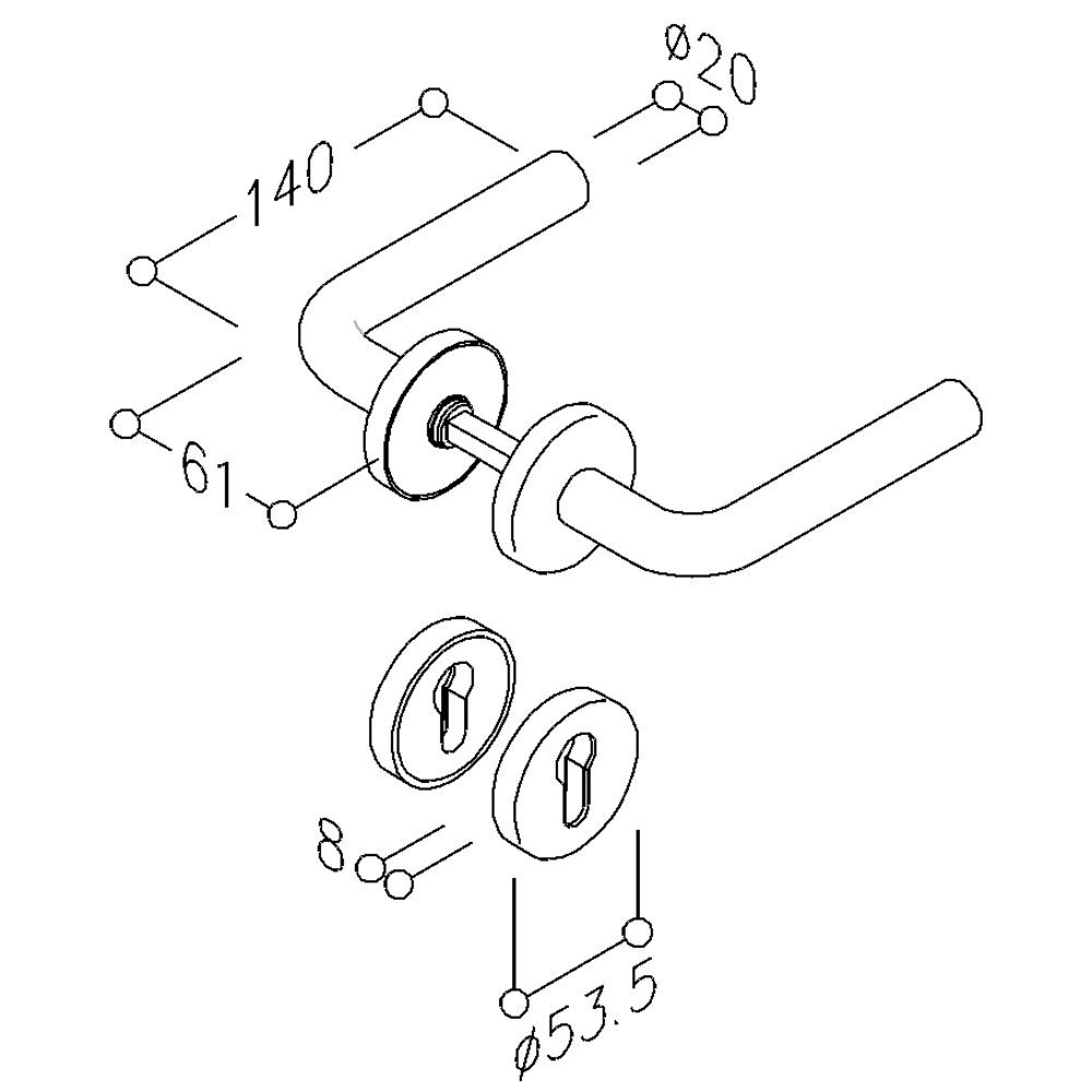HELO Objekttür Drückergarnitur, Abdeckung: mit Rosetten, Modell: EST.ZG, Modellnummer: 51, Lochung: Profilzylinder gelocht, Vierkant: 10, Material: edelstahl, Farbton: edelstahl, Oberfläche: fein matt, DIN-Richtung: DIN Links-Rechts, Lagerung: Gleitlager, wartungsfrei, festdrehbar, Befestigungstechnik: mit Stütznocken, Befestigungsart: verdeckt verschraubt, Befestigungssystem: Stiftverbindung, Material Unterkonstruktion: Kunststoff-Stahlverbundbau, Anschlagrichtung: Drücker rechts/links verwendbar, Drückerbefestigung: Vierkantstift, Drückerform: L-Form, Drückerdurchmesser: 20 mm, Drückerlänge: 140 mm, Drückerhöhe: 53 mm, Form: rund, Stärke Abdeckung: 8 mm, Türstärke min.: 65 mm, Türstärke max.: 74 mm, Türart: Außentüren, Türwerkstoff: Holz, stahl, Benutzerklasse: Klasse 4, Norm: DIN EN 1906, DIN 18255