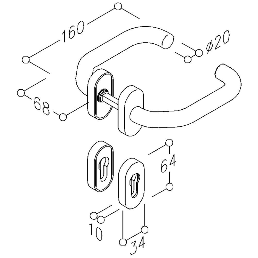 HELO Profiltür Drückergarnitur, Abdeckung: mit Rosetten, Modell: EST.ZG, Modellnummer: 71, Lochung: Profilzylinder gelocht, Vierkant: 8, Material: edelstahl, Farbton: edelstahl, Oberfläche: fein matt, DIN-Richtung: DIN Links-Rechts, Lagerung: Gleitlager, wartungsfrei, festdrehbar, Befestigungstechnik: ohne Stütznocken, Befestigungsart: verdeckt verschraubt, Befestigungssystem: Stiftverbindung, Material Unterkonstruktion: Kunststoff-Stahlverbundbau, Länge: 64 mm, Breite: 34 mm, Anschlagrichtung: Drücker rechts/links verwendbar, Drückerbefestigung: Vierkantstift, Drückerform: gekröpft, U-Form, Drückerdurchmesser: 20 mm, Drückerlänge: 160 mm, Drückerhöhe: 58 mm, Form: oval, Stärke Abdeckung: 10 mm, Türstärke min.: 60 mm, Türstärke max.: 65 mm, Türart: Rahmentüren, Türwerkstoff: aluminium, Kunststoff, Benutzerklasse: Klasse 4, Norm: DIN EN 1906, DIN 18255