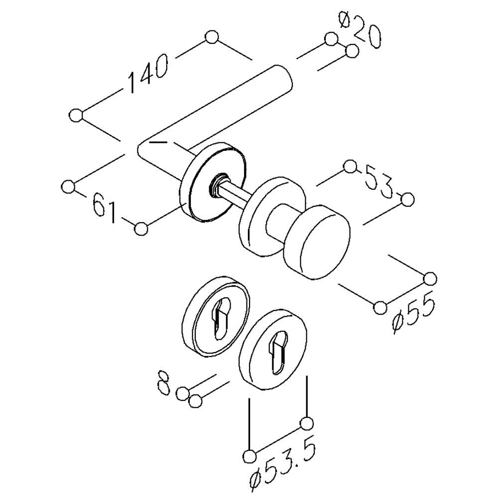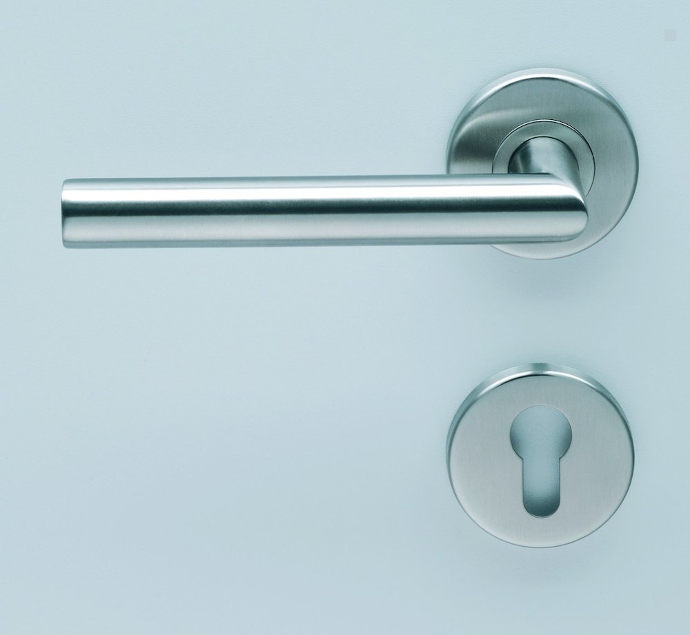HELO, Feuerhemmend-Wechselgarnitur, Abdeckung: mit Rosetten, Lochung: Profilzylinder gelocht, Vierkant: 9 mm, Modell: EST.WG, Modellnummer: FS 21, Material: Edelstahl, Farbton: edelstahl, Oberfläche: fein matt, DIN-Richtung: DIN Links, Befestigungsart: verdeckt verschraubt, Befestigungstechnik: mit Stütznocken, Benutzerklasse: Klasse 4, Stärke Abdeckung außen: 8 mm, Stärke Abdeckung innen: 8 mm, Türstärke min.: 45 mm, Türstärke max.: 54 mm, Befestigungssystem: Stiftverbindung, Form: rund, Lagerung: Gleitlager, wartungsfrei, festdrehbar, Durchmesser: 53,5 mm, Türart: Außentüren, Türwerkstoff: Holz, Stahl, Drückerbefestigung: Wechselstift, Drückerform: Gehrung, L-Form, Drückerdurchmesser: 20 mm, Drückerlänge: 140 mm, Drückerhöhe: 53 mm, Eigenschaft: Knopf fest auf Rosette, Knopfform: rund, Knopfdurchmesser: 55 mm, Knopfhöhe: 45 mm, Norm: DIN 18273, DIN 18255, DIN EN 1906, Zulassung: für Feuerschutz, für Rauchschutz, Zusatzinformation: mit beschichteten Hülsenschrauben