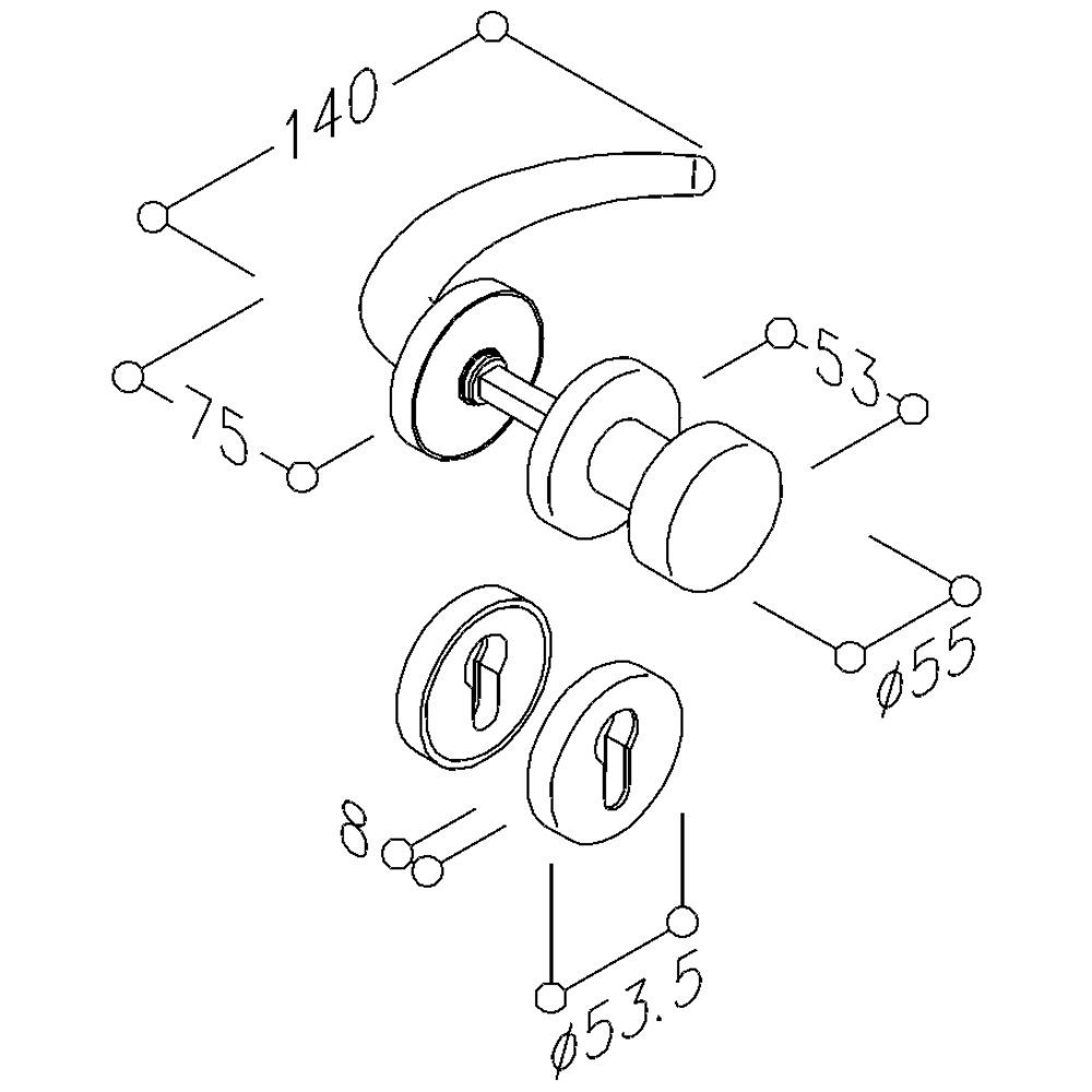 HELO, Haustür-Wechselgarnitur, Abdeckung: mit Rosetten, Lochung: Profilzylinder gelocht, Vierkant: 10 mm, Modell: EST.WG, Modellnummer: 61/K5, Material: Edelstahl, Farbton: edelstahl, Oberfläche: fein matt, DIN-Richtung: DIN Links, Befestigungsart: verdeckt verschraubt, Befestigungstechnik: mit Stütznocken, Benutzerklasse: Klasse 4, Stärke Abdeckung außen: 8 mm, Stärke Abdeckung innen: 8 mm, Türstärke min.: 65 mm, Türstärke max.: 74 mm, Befestigungssystem: Stiftverbindung, Form: rund, Lagerung: Gleitlager, wartungsfrei, festdrehbar, Durchmesser: 53,5 mm, Türart: Außentüren, Türwerkstoff: Holz, Stahl, Drückerbefestigung: Wechselstift, Drückerform: gebogen, Drückerlänge: 140 mm, Drückerhöhe: 67 mm, Eigenschaft: Knopf fest auf Rosette, Knopfform: rund, Knopfdurchmesser: 55 mm, Knopfhöhe: 45 mm, Norm: DIN 18255, DIN EN 1906, Zusatzinformation: mit beschichteten Hülsenschrauben