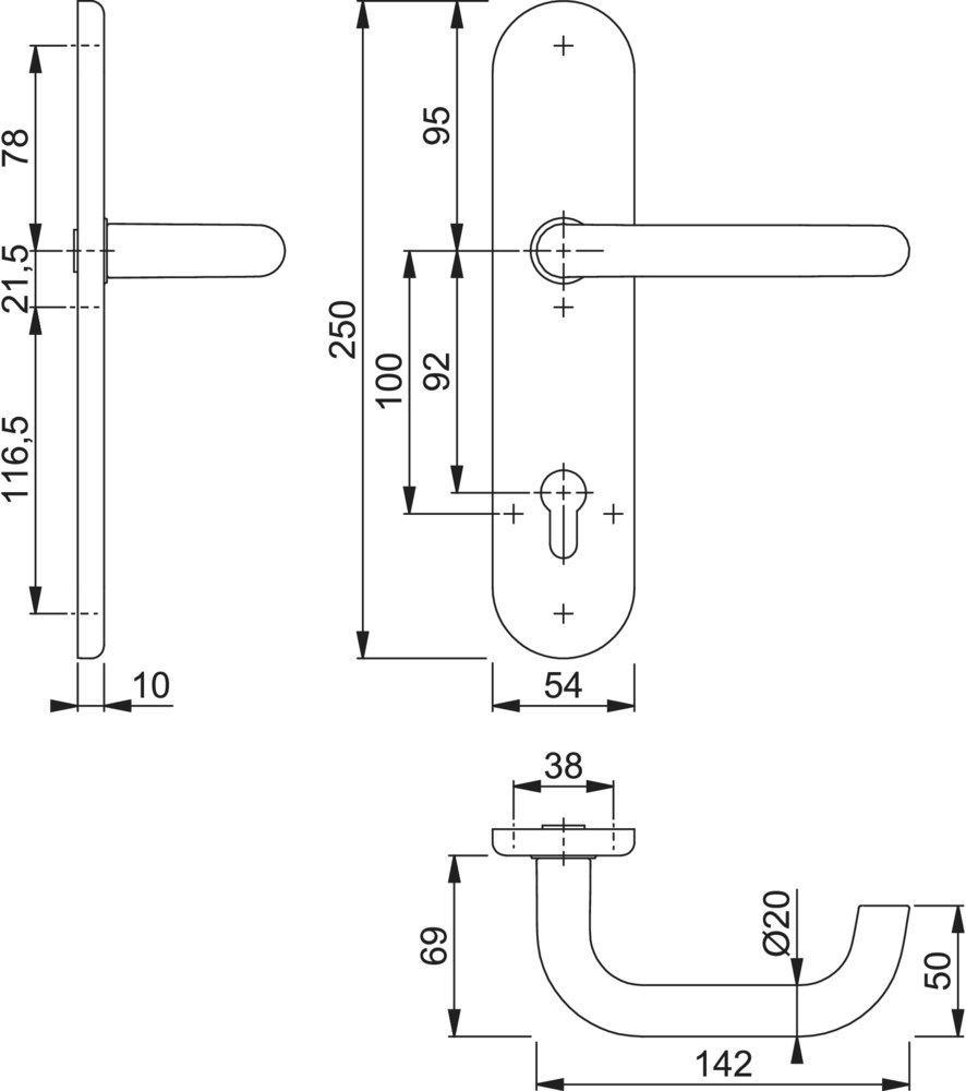 Halbgarnitur Paris 138F/3310; Produkttyp: Halbgarnitur; Produkttyp (Hersteller): Halbgarnitur; Ausführung: Langschild; Befestigungsart: verdeckt verschraubt; Befestigungstechnik: ohne Stütznocken; Form: oval; Vierkant: 10 mm; Material: Aluminium; Material Unterkonstruktion: Stahl; Form Türgriff (innen): U-Form; Durchmesser Türgriff (innen): 20 mm; Länge Türgriff (innen): 142 mm; Höhe Türgriff (innen): 69 mm; Schildbreite außen: 54 mm; Schildbreite innen: 54 mm; Schildlänge außen: 250 mm; Schildlänge innen: 250 mm; Schildstärke außen: 10 mm; Schildstärke innen: 10 mm; Lagerung: wartungsfreies Gleitlager,festdrehbar; Einsatzbereich: Haustür; Türart: Vollblatt; Türwerkstoff: Holz,Stahl; Anwendung: innen; Lochung: Profilzylinder gelocht; Entfernung: 92 mm; DIN-Richtung: DIN Links-Rechts; Farbe: silber; Farbton: naturfarben; Oberfläche: eloxiert; Ausführung Vierkant: Spreizstift