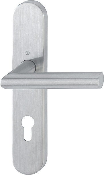 Drückergarnitur Amsterdam E1400/353H; Produkttyp: Drückergarnitur; Produkttyp (Hersteller): Drückergarnitur; Ausführung: Langschild; Befestigungsart: verdeckt verschraubt; Befestigungstechnik: mit Stütznocken; Form: oval; Vierkant: 8 mm; Material: Edelstahl; Material Unterkonstruktion: Stahl; Form Türgriff (innen): Gehrung; Form Türgriff (außen): Gehrung; Durchmesser Türgriff (innen): 20 mm; Durchmesser Türgriff (außen): 20 mm; Länge Türgriff (innen): 125 mm; Länge Türgriff (außen): 125 mm; Höhe Türgriff (innen): 58 mm; Höhe Türgriff (außen): 58 mm; Schildbreite außen: 44 mm; Schildbreite innen: 44 mm; Schildlänge außen: 230 mm; Schildlänge innen: 230 mm; Schildstärke außen: 10 mm; Schildstärke innen: 10 mm; Lagerung: festdrehbar,wartungsfreies Gleitlager,mit Rückholfeder; Einsatzbereich: Objekttür; Türart: Vollblatt; Türwerkstoff: Stahl,Holz; Norm: DIN EN 1906; Lochung: Profilzylinder gelocht; Entfernung: 72 mm; DIN-Richtung: DIN Links-Rechts; Farbe: grau; Farbton: edelstahl matt; Ausführung Vierkant: Profilstift; Türstärke min.: 40 mm; Türstärke max.: 45 mm; EN 1906 - Gebrauchskategorie: Klasse 4; EN 1906 - Korrosionsbeständigkeit: Klasse 5; Klassifizierungsschlüssel EN 1906: 47*-0150A