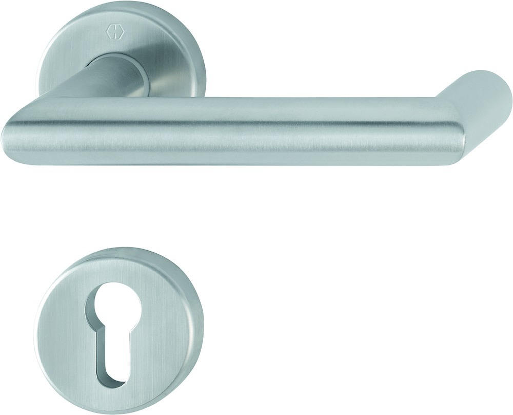 Drückergarnitur Rotterdam E1401Z/42KV/42KVS; Produkttyp: Drückergarnitur; Produkttyp (Hersteller): Drückergarnitur; Ausführung: Rosette; Befestigungsart Drückerrosette (außen): verdeckt verschraubt; Befestigungsart Drückerrosette (innen): verdeckt verschraubt; Befestigungsart Schlüsselrosette (außen): verdeckt verschraubt; Befestigungsart Schlüsselrosette (innen): verdeckt verschraubt; Befestigungstechnik: mit Stütznocken; Montageart: aufliegend; Form Drückerrosette: rund; Form Schlüsselrosette (außen): rund; Form Schlüsselrosette (innen): rund; Vierkant: 8 mm; Material: Edelstahl; Form Türgriff (innen): U-Form,Gehrung; Form Türgriff (außen): Gehrung,U-Form; Durchmesser Türgriff (innen): 20 mm; Durchmesser Türgriff (außen): 20 mm; Durchmesser Schlüsselrosette: 52 mm; Länge Türgriff (innen): 140 mm; Länge Türgriff (außen): 140 mm; Höhe Türgriff (innen): 59 mm; Höhe Türgriff (außen): 59 mm; Durchmesser Drückerrosette (außen): 52 mm; Durchmesser Drückerrosette (innen): 52 mm; Höhe Drückerrosette (außen): 8 mm; Höhe Drückerrosette (innen): 8 mm; Höhe Schlüsselrosette (außen): 8 mm; Höhe Schlüsselrosette (innen): 8 mm; Lagerung: wartungsfreies Gleitlager,mit Rückholfeder; Einsatzbereich: Objekttür; Türart: Vollblatt; Türwerkstoff: Stahl,Holz; Lochung: Profilzylinder gelocht; DIN-Richtung: DIN Links-Rechts; Farbe: grau; Farbton: edelstahl matt; Ausführung Vierkant: Vierkantstift; Türstärke min.: 37 mm; Türstärke max.: 42 mm; Norm: DIN EN 1906; EN 1906 - Gebrauchskategorie: Klasse 3; EN 1906 - Korrosionsbeständigkeit: Klasse 4; Klassifizierungsschlüssel EN 1906: 37-0140A