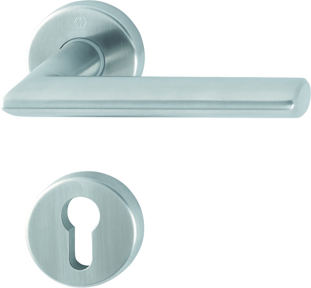 Drückergarnitur Stockholm E1140Z/42KV/42KVS; Produkttyp: Drückergarnitur; Produkttyp (Hersteller): Drückergarnitur; Ausführung: Rosette; Befestigungsart Drückerrosette (außen): verdeckt verschraubt; Befestigungsart Drückerrosette (innen): verdeckt verschraubt; Befestigungsart Schlüsselrosette (außen): verdeckt verschraubt; Befestigungsart Schlüsselrosette (innen): verdeckt verschraubt; Befestigungstechnik: mit Stütznocken; Montageart: aufliegend; Form Drückerrosette: rund; Form Schlüsselrosette (außen): rund; Form Schlüsselrosette (innen): rund; Vierkant: 8 mm; Material: Edelstahl; Form Türgriff (innen): Gehrung; Form Türgriff (außen): Gehrung; Durchmesser Schlüsselrosette: 52 mm; Länge Türgriff (innen): 131 mm; Länge Türgriff (außen): 131 mm; Höhe Türgriff (innen): 61 mm; Höhe Türgriff (außen): 61 mm; Durchmesser Drückerrosette (außen): 52 mm; Durchmesser Drückerrosette (innen): 52 mm; Höhe Drückerrosette (außen): 8 mm; Höhe Drückerrosette (innen): 8 mm; Höhe Schlüsselrosette (außen): 8 mm; Höhe Schlüsselrosette (innen): 8 mm; Lagerung: mit Rückholfeder,wartungsfreies Gleitlager; Einsatzbereich: Objekttür; Türart: Vollblatt; Türwerkstoff: Holz,Stahl; Lochung: Profilzylinder gelocht; DIN-Richtung: DIN Links-Rechts; Farbe: grau; Farbton: edelstahl matt; Ausführung Vierkant: Vierkantstift; Türstärke: 42 mm; Türstärke min.: 37 mm; Türstärke max.: 42 mm; Norm: DIN EN 1906; EN 1906 - Gebrauchskategorie: Klasse 3; EN 1906 - Korrosionsbeständigkeit: Klasse 4; Klassifizierungsschlüssel EN 1906: 37-0140A