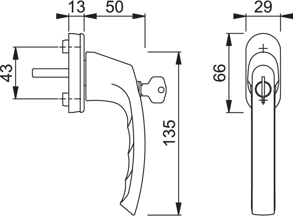 Fenstergriff Liège 0540S/U26; Produkttyp: Fenstergriff; Produkttyp (Hersteller): Fenstergriff; Ausführung: abschließbar; Rastung: 90°; Stütznocken: mit Stütznocken; Verriegelungsart: mit Druckknopfzylinder; Material: Aluminium; Montageart: aufliegend; Befestigungsart: verdeckt verschraubt; Anwendung: für nach innen öffnende Fenster und Fenstertüren; Anzahl Schlüssel: 1 St.; Länge: 135 mm; Höhe: 50 mm; Befestigungsabstand: 43 mm; Form Rosette: oval; Breite Rosette: 29 mm; Höhe Rosette: 66 mm; Stärke Rosette: 13 mm; Material Unterkonstruktion: Kunststoff; Einsatzbereich: Drehkipp; Fensterwerkstoff: Holz,Kunststoff,Aluminium; Vierkant: 7 mm; Stift vorstehend: 32 mm; DIN-Richtung: DIN Links-Rechts; Farbe: weiß; Farbton: verkehrsweiß; Oberfläche: beschichtet; Aufdruck: mit Logo; Schließung: gleichschließend; Schließungsnummer: 2W153-EW