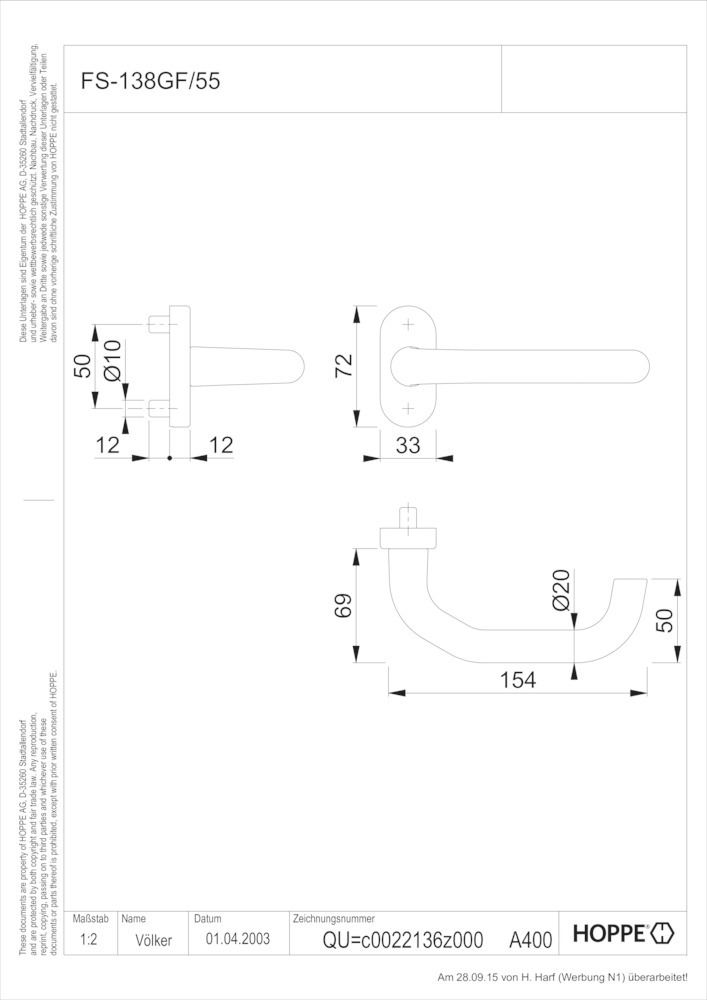 HOPPE®, Feuerhemmend-Drücker-Halbgarnitur, Modell: Paris, Modellnummer: FS-138GF/55, Vierkant: 9 mm, DIN-Richtung: DIN Links-Rechts, Material: Aluminium, Farbton: naturfarbig, Oberfläche: eloxiert, Befestigungstechnik: mit Stütznocken, Befestigungsart: verdeckt verschraubt, Befestigungssystem: Stiftverbindung,Material Unterkonstruktion : Zamak, Länge: 72 mm, Breite: 33 mm, Form: oval, Lagerung: Gleitlager, wartungsfrei, festdrehbar, Rückholfeder, Anschlagrichtung: Drücker rechts/links verwendbar, Abdeckung: ohne Schlüsselrosette, Drückerbefestigung: Antipanikvollstift, Drückerform: U-Form,Drückerdurchmesser : 20mm,Drückerlänge : 154mm,Drückerhöhe : 69mm, Stärke Abdeckung: 12 mm, Norm: DIN 18273, Zulassung: für Feuerschutz, für Rauchschutz, Türart: Außentüren, Türwerkstoff: Aluminium, Kunststoff
