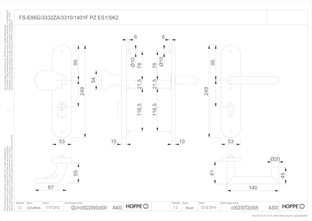 HOPPE Sicherheits-Wechselgarnitur Rotterdam FS-E86G/3332ZA/3310/1401F,LS ov.,15mm,ES1,ZA/PZ 92/9,F69,TS 67-72