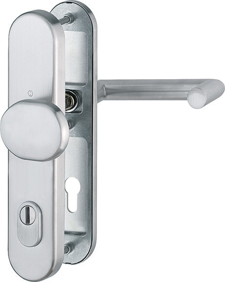 Sicherheits-Wechselgarnitur Rotterdam FS-E86G/3332ZA/3310/1401F; Produkttyp: Sicherheits-Wechselgarnitur; Produkttyp (Hersteller): Sicherheits-Wechselgarnitur; Ausführung: Langschild; Form: oval; Zulassung: für Feuerschutz,für Rauchschutz; Material: Edelstahl; Form Türgriff (innen): Gehrung,U-Form; Form Türgriff (außen): gekröpft; Ausführung Türgriff (außen): fest; Länge Türgriff (innen): 140 mm; Länge Türgriff (außen): 53 mm; Breite Türgriff (außen): 87 mm; Höhe Türgriff (innen): 61 mm; Höhe Türgriff (außen): 55 mm; Durchmesser Türgriff (innen): 20 mm; Material Unterkonstruktion (innen): Zamak/Stahl; Material Unterkonstruktion (außen): Stahl; Einsatzbereich: Objekttür; Türart: Vollblatt; Türwerkstoff: Holz,Stahl; Zylinderabdeckung: mit Zylinderabdeckung; DIN-Richtung: DIN Links-Rechts; Widerstandsklasse nach DIN 18257: ES 1; Vierkant: 9 mm; Entfernung: 92 mm; Lochung: Profilzylinder gelocht; Ausführung Vierkant: Rollenwechselstift; Farbe: grau; Farbton: edelstahl matt; Schildlänge außen: 249 mm; Schildlänge innen: 249 mm; Schildbreite außen: 53 mm; Schildbreite innen: 53 mm; Schildstärke innen: 10 mm; Schildstärke außen: 15 mm; Zylinderüberstand min.: 10 mm; Zylinderüberstand max.: 18 mm; Türstärke min.: 67 mm; Türstärke max.: 72 mm; Norm: DIN EN 1906,DIN 18257,DIN 18273,DIN EN 179; EN 1906 - Gebrauchskategorie: Klasse 4; EN 1906 - Korrosionsbeständigkeit: Klasse 4; Klassifizierungsschlüssel EN 1906: 47-D1142U