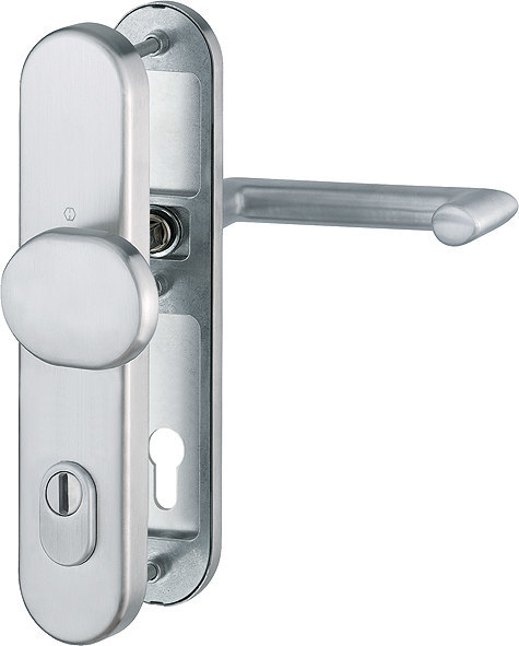Sicherheits-Wechselgarnitur Stockholm FS-E86G/3332ZA/3310/1141F; Produkttyp: Sicherheits-Wechselgarnitur; Produkttyp (Hersteller): Sicherheits-Wechselgarnitur; Ausführung: Langschild; Form: oval; Zulassung: für Feuerschutz,für Rauchschutz; Material: Edelstahl; Form Türgriff (innen): Gehrung,U-Form; Form Türgriff (außen): gekröpft; Ausführung Türgriff (außen): fest; Gewinde Knopf/Griffplatte: M12; Länge Türgriff (innen): 140 mm; Länge Türgriff (außen): 53 mm; Breite Türgriff (außen): 87 mm; Höhe Türgriff (innen): 63 mm; Höhe Türgriff (außen): 55 mm; Material Unterkonstruktion (innen): Zamak; Material Unterkonstruktion (außen): Stahl; Gütesiegel: RAL-GZ; Einsatzbereich: Objekttür; Türart: Vollblatt; Türwerkstoff: Holz,Stahl; Zylinderabdeckung: ohne Zylinderabdeckung; DIN-Richtung: DIN Links-Rechts; Widerstandsklasse nach DIN 18257: ES 1; Vierkant: 9 mm; Entfernung: 92 mm; Lochung: Profilzylinder gelocht; Ausführung Vierkant: Rollenwechselstift; Farbe: grau; Farbton: edelstahl matt; Schildlänge außen: 249 mm; Schildlänge innen: 249 mm; Schildbreite außen: 53 mm; Schildbreite innen: 53 mm; Schildstärke innen: 10 mm; Schildstärke außen: 15 mm; Zylinderüberstand min.: 10 mm; Zylinderüberstand max.: 18 mm; Türstärke min.: 67 mm; Türstärke max.: 72 mm; Norm: DIN 18273,DIN EN 179,DIN 18257,DIN EN 1906,EN 1670; EN 1906 - Gebrauchskategorie: Klasse 4; EN 1906 - Korrosionsbeständigkeit: Klasse 4; Klassifizierungsschlüssel EN 1906: 47-D1142U