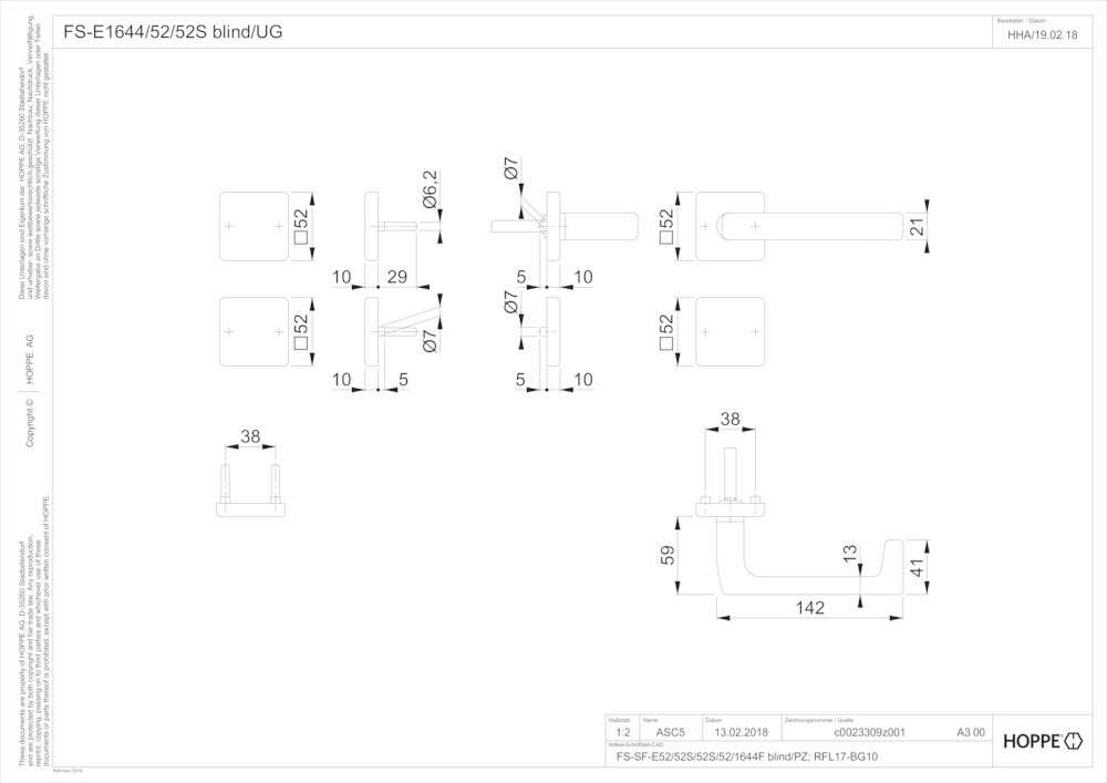 HOPPE Standflügelgarnitur Dallas FS-E1644/52/52S,BL/UG,9,F69,TS 40-65