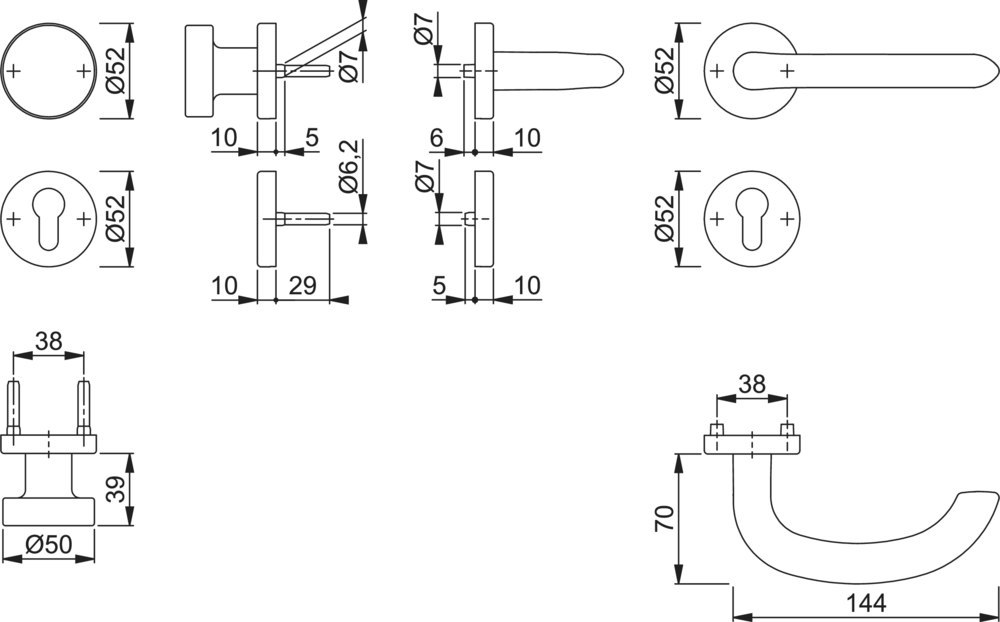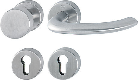 Wechselgarnitur Marseille FS-E58/42H/42HS/1138; Produkttyp: Wechselgarnitur; Produkttyp (Hersteller): Wechselgarnitur; Ausführung: Rosette; Befestigungsart Drückerrosette (außen): verdeckt verschraubt; Befestigungsart Drückerrosette (innen): verdeckt verschraubt; Befestigungsart Schlüsselrosette (außen): verdeckt verschraubt; Befestigungsart Schlüsselrosette (innen): verdeckt verschraubt; Befestigungstechnik: mit Stütznocken; Montageart: aufliegend; Form Drückerrosette: rund; Form Schlüsselrosette (außen): rund; Form Schlüsselrosette (innen): rund; Vierkant: 9 mm; Material: Edelstahl; Form Türgriff (innen): gebogen; Form Türgriff (außen): Flachknopf; Ausführung Türgriff (außen): fest; Gewinde Knopf/Griffplatte: M12; Durchmesser Türgriff (außen): 50 mm; Durchmesser Schlüsselrosette: 52 mm; Länge Türgriff (innen): 144 mm; Höhe Türgriff (innen): 70 mm; Höhe Türgriff (außen): 32 mm; Durchmesser Drückerrosette (außen): 52 mm; Durchmesser Drückerrosette (innen): 52 mm; Höhe Drückerrosette (außen): 10 mm; Höhe Drückerrosette (innen): 10 mm; Höhe Schlüsselrosette (außen): 10 mm; Höhe Schlüsselrosette (innen): 10 mm; Lagerung: mit Rückholfeder,festdrehbar,wartungsfreies Gleitlager; Einsatzbereich: Objekttür; Türart: Vollblatt; Türwerkstoff: Holz,Stahl; Lochung: Profilzylinder gelocht; DIN-Richtung: DIN Links-Rechts; Farbe: grau; Farbton: edelstahl matt; Ausführung Vierkant: Rollenwechselstift; Türstärke min.: 40 mm; Türstärke max.: 65 mm; Norm: DIN EN 179,DIN 18273,DIN EN 1906; Zulassung: für Fluchttüren,für Rauchschutz,für Feuerschutz; EN 1906 - Gebrauchskategorie: Klasse 4; EN 1906 - Korrosionsbeständigkeit: Klasse 5; Klassifizierungsschlüssel EN 1906: 47*-D1150A