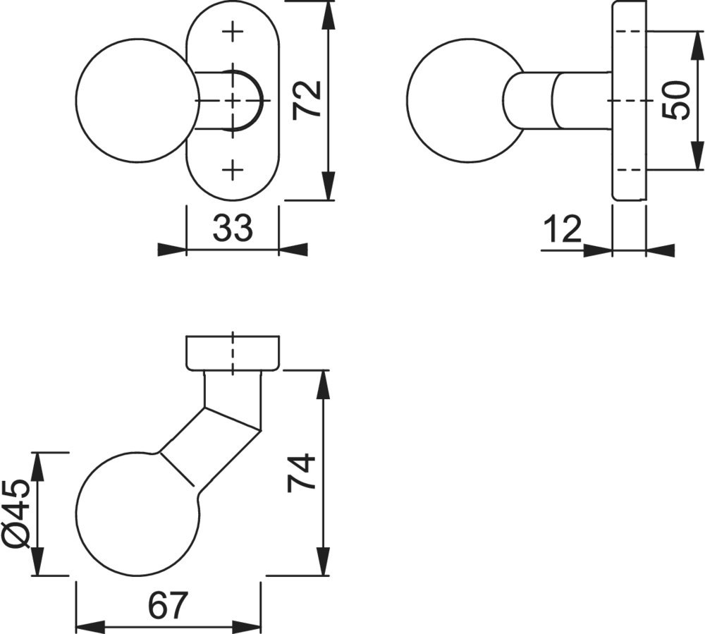 Halbgarnitur E50G/55; Produkttyp: Halbgarnitur; Produkttyp (Hersteller): Knopfrosette; Ausführung: ohne Schlüsselrosette; Befestigungsart Drückerrosette (außen): verdeckt verschraubt; Befestigungstechnik: ohne Stütznocken; Montageart: aufliegend; Form Drückerrosette: oval; Material: Edelstahl; Material Unterkonstruktion (Griffrosette): Zamak; Form Türgriff (außen): Kugelknopf; Ausführung Türgriff (außen): fest; Durchmesser Türgriff (außen): 45 mm; Breite Türgriff (außen): 67 mm; Höhe Türgriff (außen): 74 mm; Breite Drückerrosette (außen): 33 mm; Länge Drückerrosette (außen): 72 mm; Höhe Drückerrosette (außen): 12 mm; Lagerung: wartungsfreies Gleitlager; Einsatzbereich: Haustür,Wohnungseingangstür; Türart: Rohrrahmen; Türwerkstoff: Aluminium,Kunststoff; Anwendung: außen; DIN-Richtung: DIN Links-Rechts; Farbe: grau; Farbton: edelstahl matt-SecuSan; Ausführung Vierkant: Profilstift