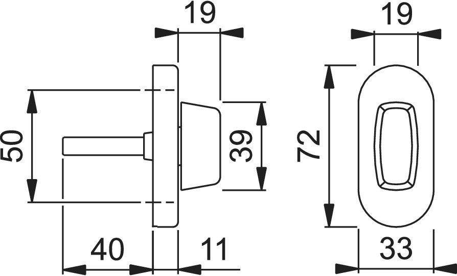 Riegelolive EOL28/55S; Produkttyp: Riegelolive; Produkttyp (Hersteller): Olive auf Rosette; Ausführung: Rosette; Material: Edelstahl; Form Rosette: oval; Befestigungsart: verdeckt verschraubt; Länge: 72 mm; Breite: 33 mm; Höhe Rosette: 11 mm; Befestigungsabstand: 50 mm; Material Unterkonstruktion: Zamak; Einsatzbereich: Mehrfachverriegelung; Anwendung: für Türspaltsicherung; Türart: Rohrrahmen; Farbe: grau; Farbton: edelstahl matt; Vierkant: 8 mm; Stift vorstehend: 40 mm