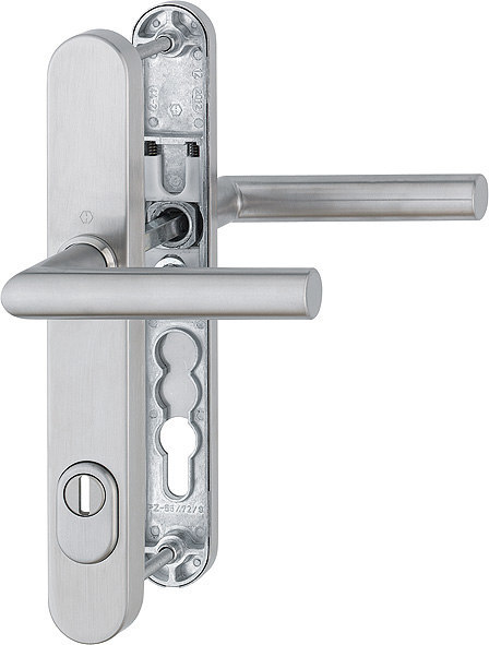 Sicherheits-Drückergarnitur Amsterdam E1400F/3359ZA/3357N; Produkttyp: Sicherheits-Drückergarnitur; Produkttyp (Hersteller): Sicherheits-Drückergarnitur; Ausführung: Langschild; Form: oval; Material: Edelstahl; Form Türgriff (innen): Gehrung; Form Türgriff (außen): Gehrung; Länge Türgriff (innen): 125 mm; Länge Türgriff (außen): 125 mm; Höhe Türgriff (innen): 61 mm; Höhe Türgriff (außen): 61 mm; Durchmesser Türgriff (innen): 20 mm; Durchmesser Türgriff (außen): 20 mm; Material Unterkonstruktion (innen): Zamak; Material Unterkonstruktion (außen): Stahl; Gütesiegel: RAL-GZ; Einsatzbereich: Haustür; Türart: Rohrrahmen; Türwerkstoff: Aluminium,Kunststoff; Zylinderabdeckung: mit Zylinderabdeckung; DIN-Richtung: DIN Links-Rechts; Widerstandsklasse nach DIN 18257: ES 1; Vierkant: 8 mm; Entfernung: 92 mm; Lochung: Profilzylinder gelocht; Ausführung Vierkant: Vierkantvollstift; Farbe: grau; Farbton: edelstahl matt; Schildlänge außen: 249 mm; Schildlänge innen: 249 mm; Schildbreite außen: 35 mm; Schildbreite innen: 35 mm; Schildstärke innen: 10 mm; Schildstärke außen: 15 mm; Zylinderüberstand min.: 10 mm; Zylinderüberstand max.: 18 mm; Türstärke min.: 67 mm; Türstärke max.: 72 mm; Norm: DIN 18257