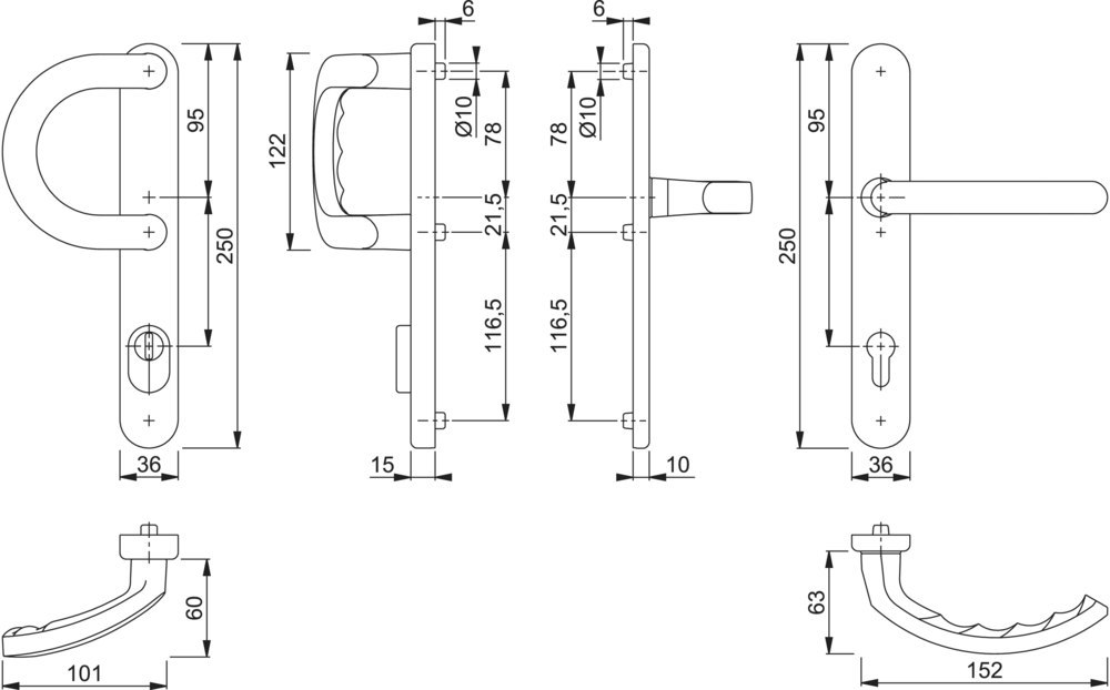| Form Türgriff (außen): | Stoßgriff, gebogen, halbrund |
