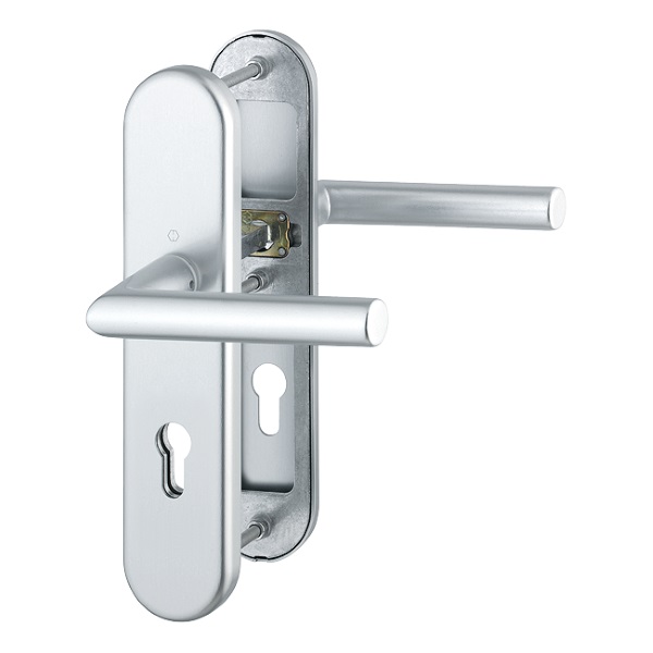 Dieser Hoppe Amsterdam Türgriff ist als Schutzgarnitur konzipiert. Die Schutzgarnitur ist wahlweise in Edelstahl oder Aluminium erhältlich. In der Version mit Zylinderabdeckung eignet sich die Hoppe Amsterdam Schutzgarnitur besonders zum Einsatz an Wohnungseingangs- und Hauseingangstüren und entspricht der Schutzklasse 2 (nach DIN EN 1906). Der Zylinderziehschutz ist für Zylinderüberstände von 10-18 mm ausgelegt. Die Befestigung erfolgt mit vedeckten durchgehenden M6-Gewindeschrauben.
