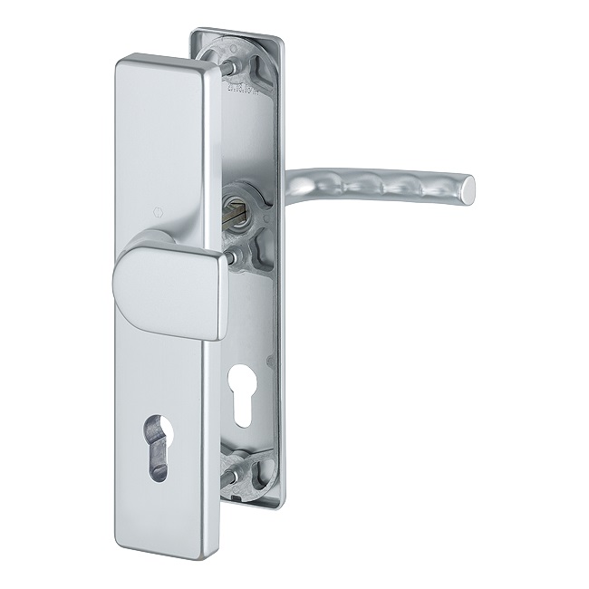 Dieser Hoppe Birmingham Türgriff ist als Schutzgarnitur konzipiert. Die Schutzgarnitur ist nur in Aluminium erhältlich. Es gibt sie in den Farben F1-Alu Natur, F2-Neusilber und F4-Bronze. Die Hoppe Birmingham Schutzgarnitur entspricht der Schutzklasse 1 (nach DIN 18257). Die Befestigung erfolgt mit innen sichtbaren durchgehenden M6-Gewindeschrauben.