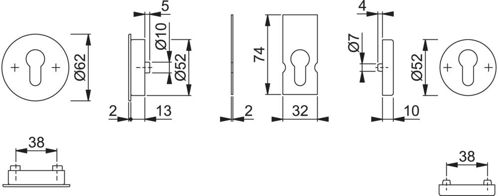 Schutzrosette E29NSB/42HS; Produkttyp: Schutzrosette; Produkttyp (Hersteller): Schutzrosette; Form: flach,rund; Material: Edelstahl; Montageart: aufliegend; Befestigungsart: verdeckt verschraubt; Befestigungsabstand: 38 mm; Material Unterkonstruktion (innen): Stahl; Material Unterkonstruktion (außen): Stahl; Einsatzbereich: Haustür; Türart: Vollblatt; Türwerkstoff: Holz,Stahl; Zylinderabdeckung: ohne Zylinderabdeckung; Widerstandsklasse nach DIN 18257: ES 1; Lochung: Profilzylinder gelocht; Farbe: grau; Farbton: edelstahl matt; Höhe Rosette (außen): 2 mm; Höhe Rosette (innen): 10 mm; Türstärke min.: 65 mm; Türstärke max.: 75 mm; Norm: DIN 18257; Zusatzinformation: für die Befestigung am Türschloss als Anbohrschutz,separate Stahlplatte mit Klebepad