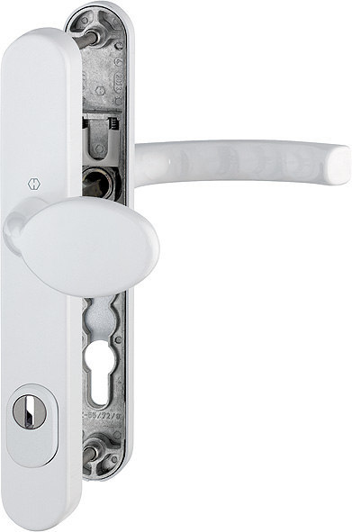Sicherheits-Wechselgarnitur Liège 76G/3359ZA/3357N/1540; Produkttyp: Sicherheits-Wechselgarnitur; Produkttyp (Hersteller): Sicherheits-Wechselgarnitur; Ausführung: Langschild; Form: oval; Material: Aluminium; Form Türgriff (innen): gebogen; Form Türgriff (außen): gekröpft; Ausführung Türgriff (außen): fest; Gewinde Knopf/Griffplatte: M12; Länge Türgriff (innen): 132 mm; Länge Türgriff (außen): 49 mm; Breite Türgriff (außen): 90 mm; Höhe Türgriff (innen): 56 mm; Höhe Türgriff (außen): 50 mm; Material Unterkonstruktion (innen): Zamak; Material Unterkonstruktion (außen): Stahl; Gütesiegel: RAL-GZ; Einsatzbereich: Haustür; Türart: Rohrrahmen; Türwerkstoff: Aluminium,Kunststoff; Zylinderabdeckung: mit Zylinderabdeckung; DIN-Richtung: DIN Links-Rechts; Vierkant: 8 mm; Entfernung: 92 mm; Lochung: Profilzylinder gelocht; Ausführung Vierkant: Rollenwechselstift; Farbe: weiß; Farbton: verkehrsweiß; Oberfläche: beschichtet; Schildlänge außen: 250 mm; Schildlänge innen: 250 mm; Schildbreite außen: 36 mm; Schildbreite innen: 36 mm; Schildstärke innen: 10 mm; Schildstärke außen: 15 mm; Zylinderüberstand min.: 10 mm; Zylinderüberstand max.: 18 mm; Türstärke min.: 67 mm; Türstärke max.: 72 mm; Norm: DIN 18257