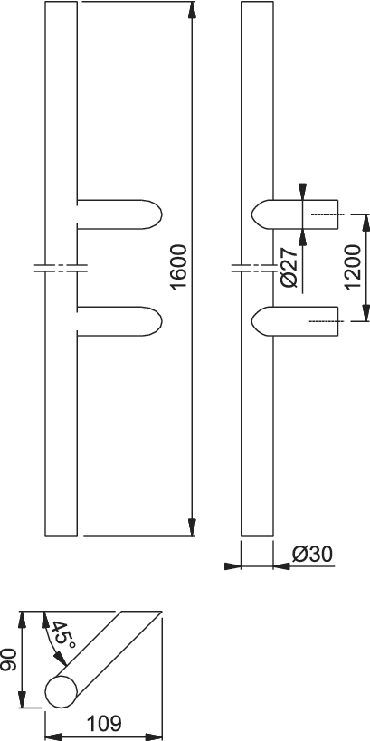 HOPPE®, Haustür-Stoßgriff, Ausführung: gerade, Modellnummer: E5012, Befestigungsabstand: 1.200mm, Griffdicke: 30mm, Griffhöhe: 90mm, Grifflänge: 1600mm, Griffbreite: 109mm, Material: Edelstahl, Farbton: edelstahl matt,Durchmesser Stütze : 27mm, Kröpfung: 45°, Befestigungsart: verdeckt verschraubt, DIN-Richtung: DIN Links-Rechts, Stütze: schräg, Form: rund, Türflügelanzahl: einflügelig, zweiflügelig, Türwerkstoff: Holz, Stahl