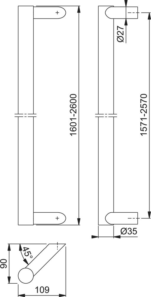 Produktinformationen "HOPPE Stoßgriff E5062 XL,Befestigungsabstand 1.571-2.570,Länge 1.601-2.600,Durchmesser 35,F69"