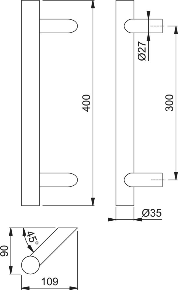 Stoßgriff E5062; Produkttyp: Stoßgriff; Produkttyp (Hersteller): Bügelgriff; Breite: 109 mm; Form: gerade; Befestigungsart: verdeckt verschraubt; Einsatzbereich: Objekttür,Haustür; Material: Edelstahl; Türwerkstoff: Kunststoff,Holz,Aluminium; DIN-Richtung: DIN Links-Rechts; Befestigungsabstand: 300 mm; Länge: 400 mm; Durchmesser: 35 mm; Höhe: 90 mm; Ausführung Stütze: schräg; Farbe: grau; Farbton: edelstahl matt