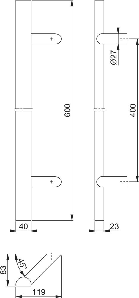 Stoßgriff E5092; Produkttyp: Stoßgriff; Produkttyp (Hersteller): Bügelgriff; Breite: 119 mm; Form: gerade; Befestigungsart: verdeckt verschraubt; Einsatzbereich: Haustür,Objekttür; Material: Edelstahl; Türwerkstoff: Holz,Aluminium,Kunststoff; DIN-Richtung: DIN Links-Rechts; Befestigungsabstand: 400 mm; Länge: 600 mm; Durchmesser: 40x23 mm; Höhe: 83 mm; Farbe: grau; Farbton: edelstahl matt