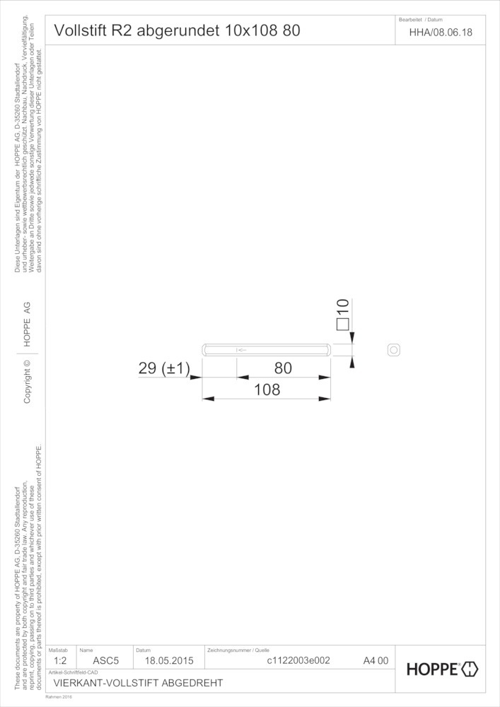 Produktinformationen "HOPPE Vierkantstift R2, 10x108mm verzinkt"